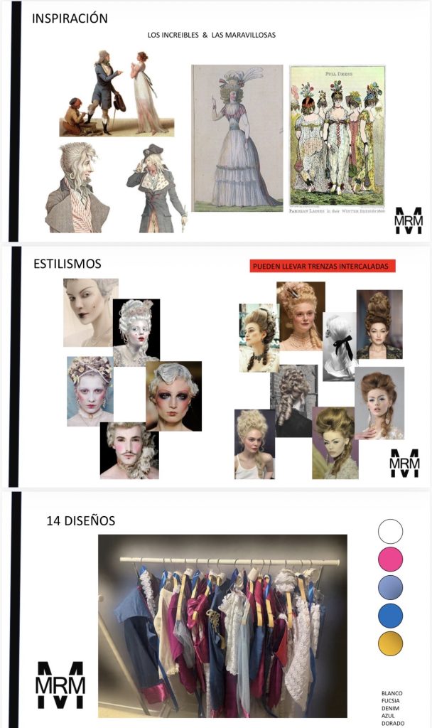 En maquillaje, la propuesta se inspira en la estética dramática de época, con rostros blanqueados y empolvados, mejillas sonrojadas, labios pequeños en forma de corazón y una mirada intensa, trabajada con sombras negras, doradas y rosadas. Las cejas se cubrirán para dibujar una línea fina y definida, reforzando el carácter teatral del conjunto.